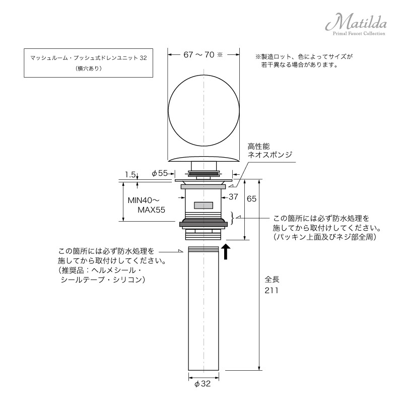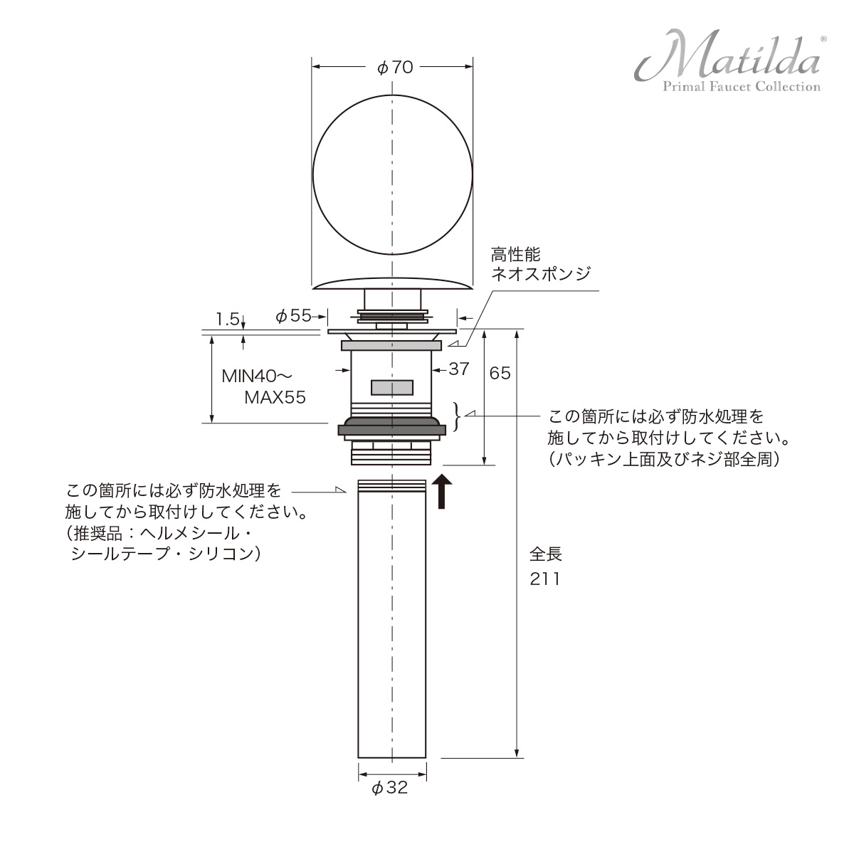 - マチルダ純正の最新型のプッシュ式排水金具と、目皿を綺麗に隠すマッシュルームヘッドの組み合わせです。
