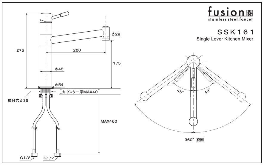 【fusion】SSK161 ステンレス・シングルレバーキッチン混合栓