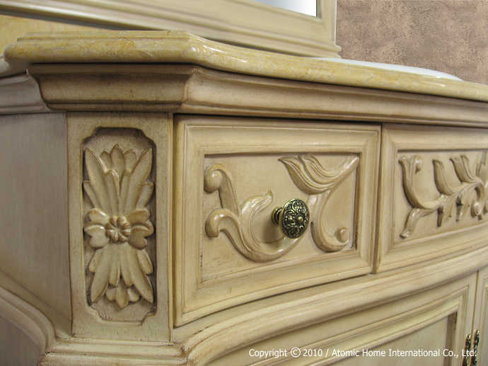 - 洗面台本体及び鏡枠には天然木を使用し、熟練の職人による小細工なしのハンドメイドで彫刻が施されています。左右両サイドの引き出しは、上記写真のように実際に使用出来ますのでとても便利です。意外と大きく奥行きも結構ありますので化粧品や石鹸、ヒゲ剃りなどの収納にご使用ください。